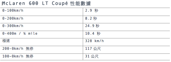 承襲Longtail(LT)「長尾巴」傳奇,以570S Coupe為基體打造的McLaren 600LT,將經典3.8升V8雙渦輪引擎再度升級,能輸出600 PS及620 Nm強大動能,0 – 200 km/h則是驚人的8.2秒,極速可至328 km/h。