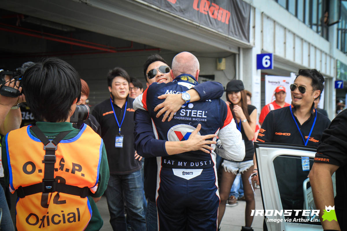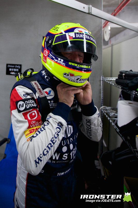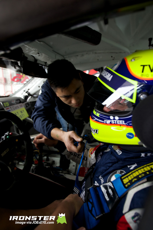 正賽前沒吃中飯的Tom,其實在今天變得挺嚴肅的,他自己看手錶發現時間差不多了,就一語不發的帶上帽子走向賽車,而事實上Pit Crew卻有些東西還沒整備好,這對車隊所有人其實是一種不小的壓力。其實 Tom像多數外國人一樣非常守時,跟車隊的這幾天行程只要先說好時間,他一定是前三名集合的,而Tom的這種壓力或許就是江榕豪所要的。因為這解釋了一個車隊要達到國際化的層次、服務國際化的車手,準時不過是最基本的要求而已...,而當江榕豪在以前身兼車手及車隊老闆,其實總是有分身乏術的困擾,但隨著一次次征戰的磨練,整個團隊在這次Tom參賽的表現其實已經有了很高的效率。