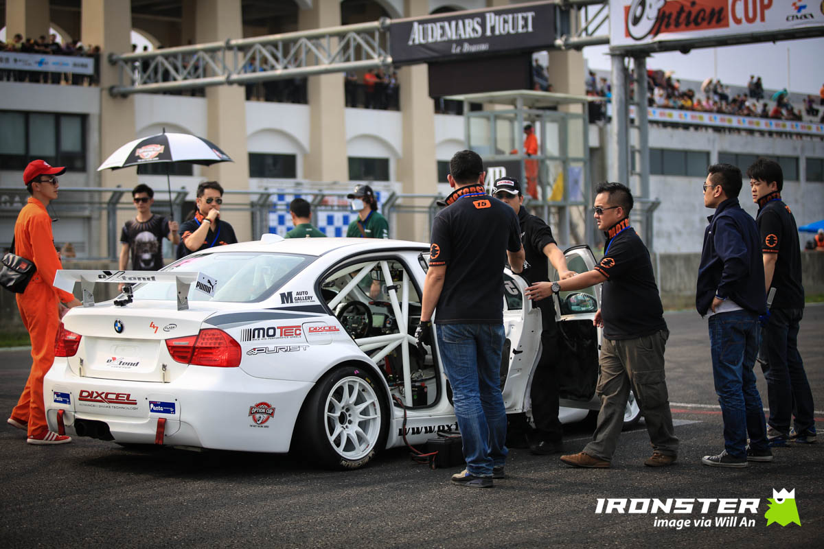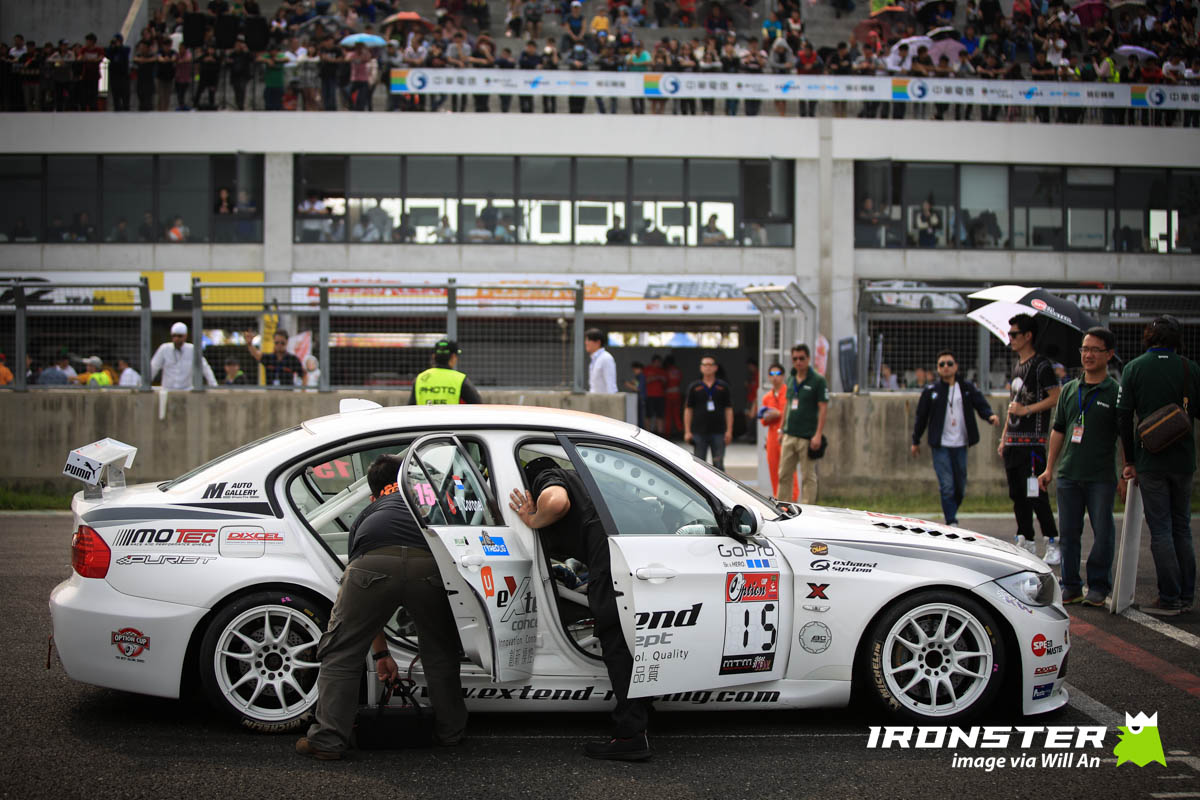 拍攝這張照片時,離正賽起跑只剩下五分鐘,這輛美麗的賽車卻真的莫名發不動。這種困境直到賽前一分半鐘都無法排除時,因為必須維持比賽的準時進行,Marshall只能殘酷的將江榕豪等四人趕出場。眼看著Extend車隊四個人孤單離開賽道閘門,我們可以想像他們當下的眼睛應該都濕了吧!而此時大會廣播也替Tom擔心等一下他是否能順利出賽,而此時所有其他車隊跟觀眾幾乎都一片寂靜。