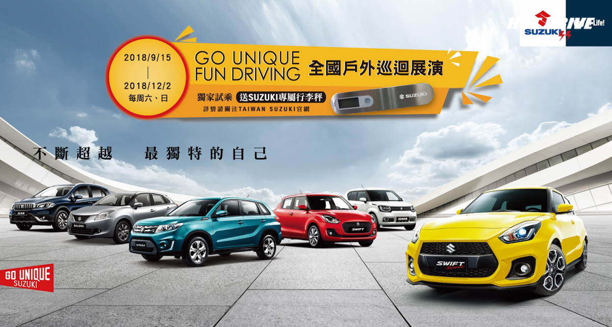 秉持著「GO UNIQUE」品牌精神,以及新世代產品陸續到位後,SUZUKI在近兩年展現出前所未有的全新氣象與銷售佳績,為讓更多消費者感受「GO UNIQUE」的精神與體驗全系列優質車款,TAIWAN SUZUKI 將自2018年9月15日起展開SUZUKI在台以來首次規模最大及為期最長的「SUZUKI GO UNIQUE FUN DRIVING全國巡迴戶外展演活動」,至12月2日在每個週末於全台各地都可以近距離體驗SUZUKI新世代車款,體認「GO UNIQUE」獨一無二的駕馭新生活!