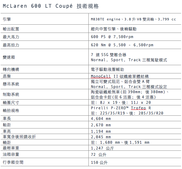 今年7/12才於英國舉行的Goodwood Festival of Speed首度亮相的McLaren 600LT,相隔一個月即在8/16由總代理永三汽車火速在台發表上市,正式售價為1380萬元起,McLaren 600LT以0 – 100 km/h加速僅需2.9秒成績與老大哥McLaren 675LT並駕齊驅。