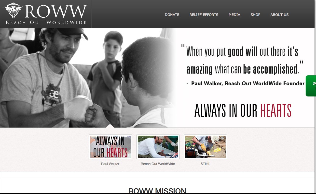 不談全球媒體已提過的Paul的事蹟,大家也暫且把電影中的Paul忘記一下,實際上的Paul是個完全沒有明星架勢的人。他在成名之後,因為有了回饋社會的想法,成立了一個基金會~”Reach Out Worldwide”,簡稱為”ROWW”(大家可自行連結www.roww.org),這基金會主要是針對國際間的大型天災人禍,進行物資及金錢的緊急援助,如:菲律賓風災、海地地震、卡崔納颶風、尼泊爾地震等,你都可以在網站上看到Paul Walker在當地的身影,當然在美國較健全的法令下,你也可以在線上進行小額捐款。