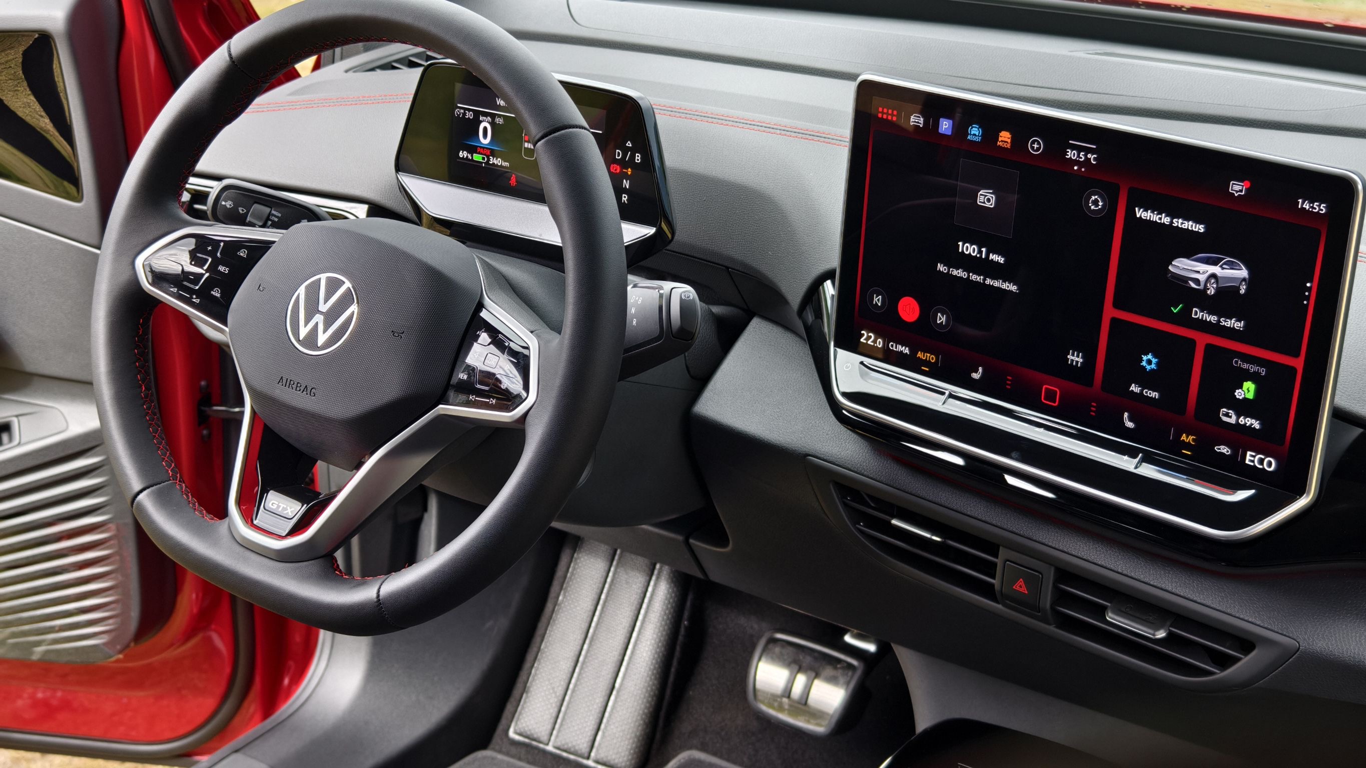 我們第一天試駕的ID.5 GTX採340hp雙馬達四驅設定,外觀上進行了局部黑化處理,坐上車的第一印象很好,駕駛視野開闊,座椅泡綿略硬,包覆性相當不錯,內裝用料為典型VW風格,組裝用料均頗為紮實。