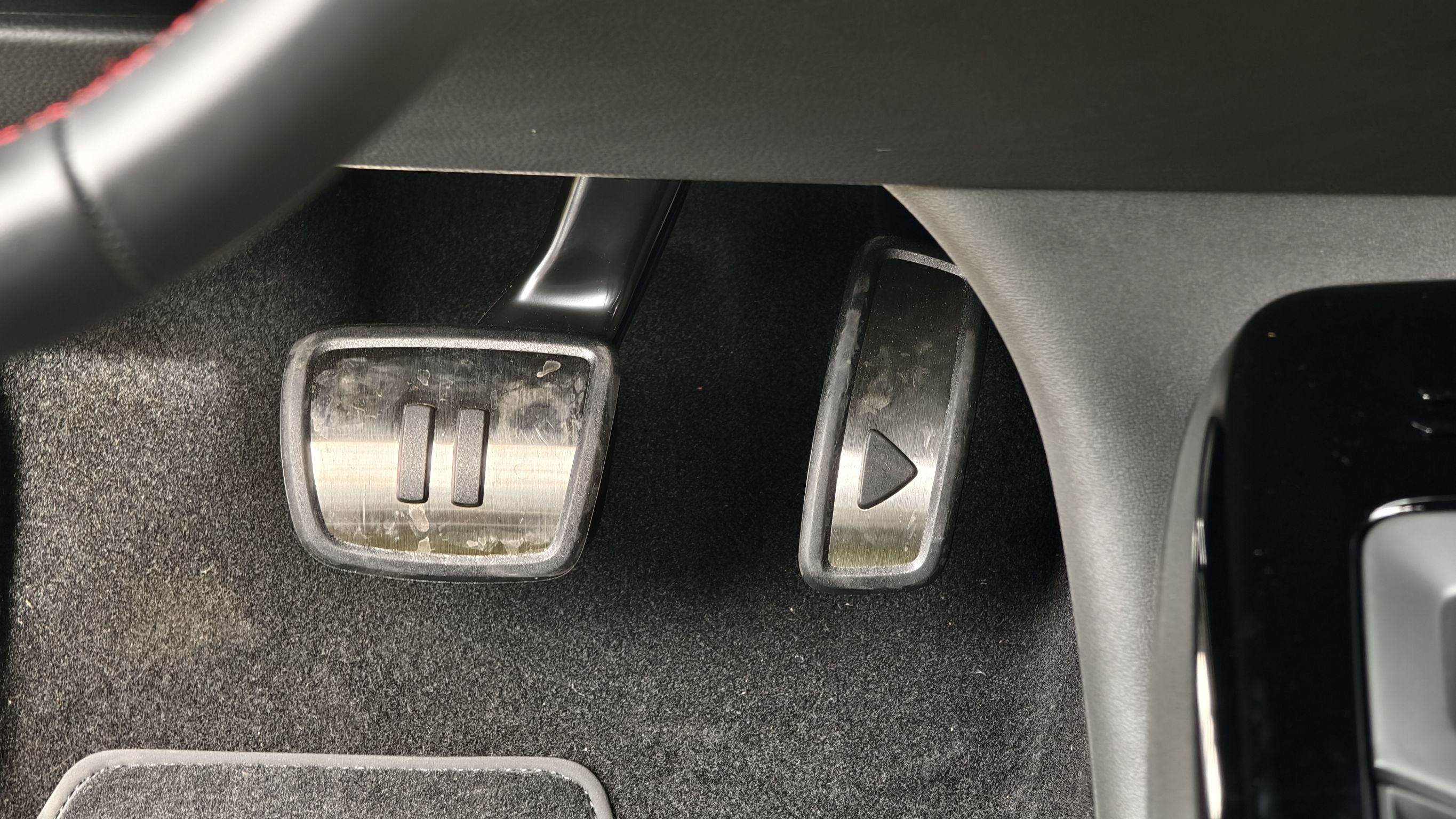 掛檔上路,第一印象是電門相當柔順,普通模式下電門行程頗長,而油門踏板與煞車踏板上有類似Play與Pause的圖樣,相當逗趣。性能方面,340hp最大馬力官方零百加速僅為5.4秒,重點是急加速時車頭的抬升並不明顯,在運動模式下電門相當靈敏,對應約2.2噸的車重毫不費力。必須注意的是,原廠提供多段動能回充力道的調節,但在緊急制動時前段會因為依賴回充減速而有點空虛,後段才會有明顯的機械制動,建議新手買家激烈操駕時先多點適應。