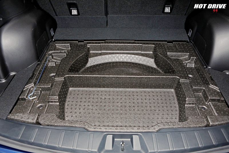 行李箱容積在後座未傾倒時,有著520公升不錯的水準,開口及承載空間相當平整,置物板掀起後下方也具有置物雜物的空間,再下方則為備胎。