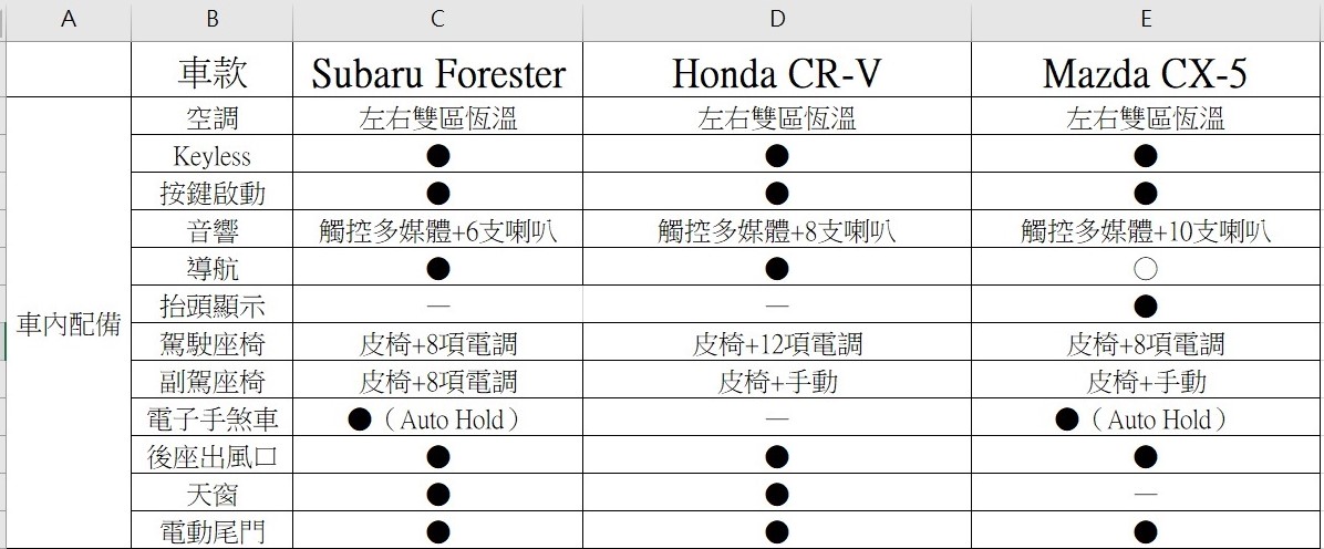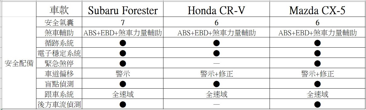☆以下為Forester、CR-V、CX-5在「外觀」、「內裝」、「安全」三大配備項目的表格對照。