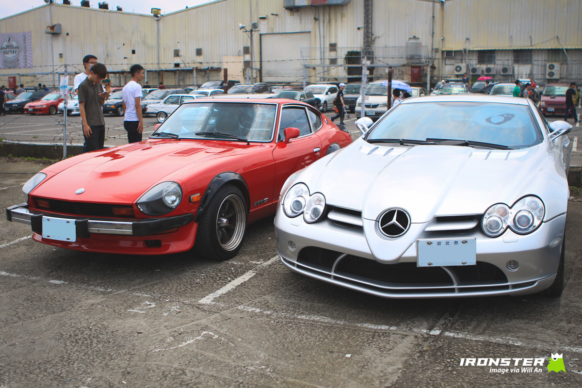 在經典90社團曝光度非常高的惡魔Z,很明顯看到旁邊的車友是用立正表達敬意,右側則停放著俗稱“蝙蝠車”的M-BenzSLR。
