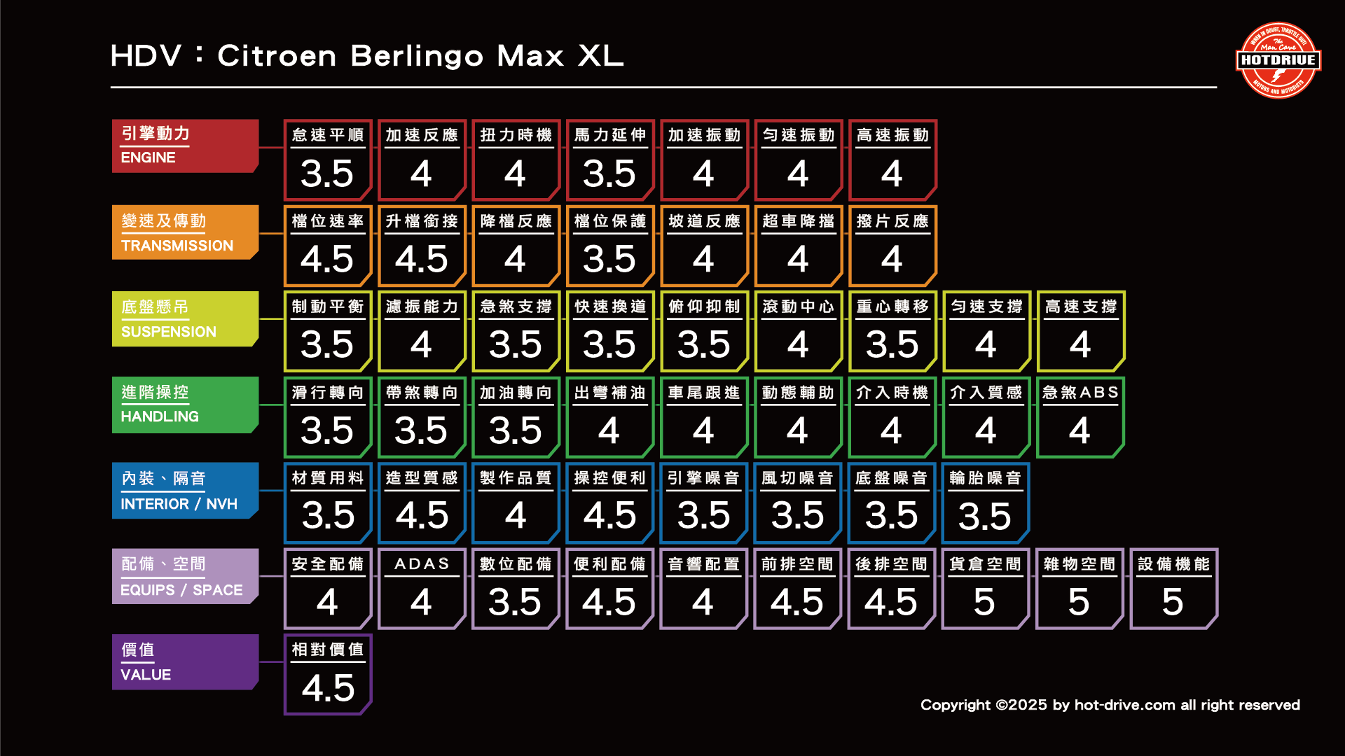 動力底盤方面,1.5升柴油動力只能說夠用,而且運作品質不錯,底盤也不會砸了雪鐵龍的招牌,再加上非常有競爭力的價格,難怪在「購買價值」項目可以得到熱駕極高的評價!!