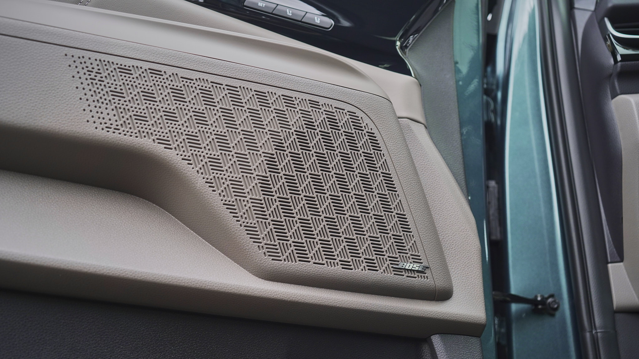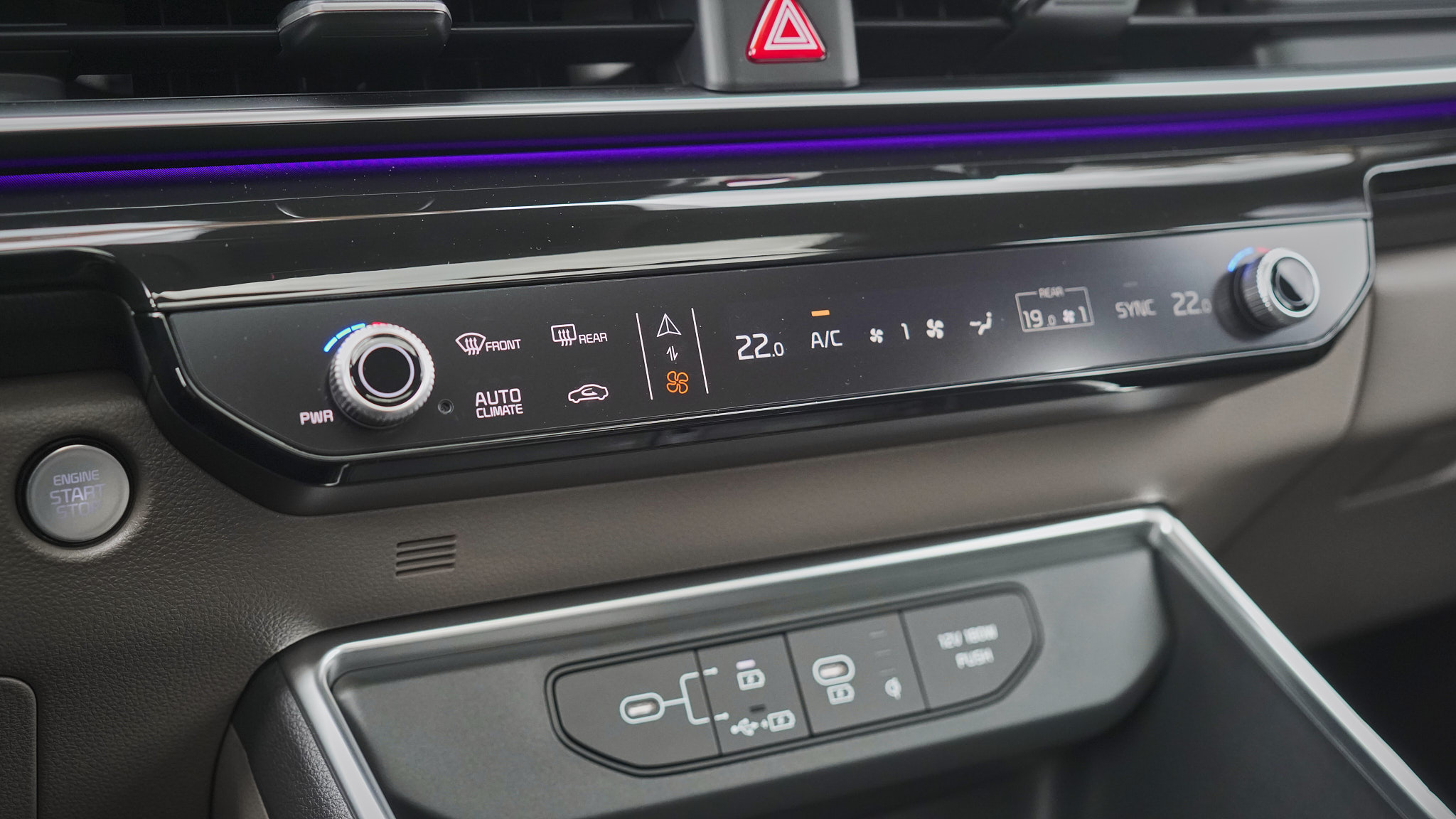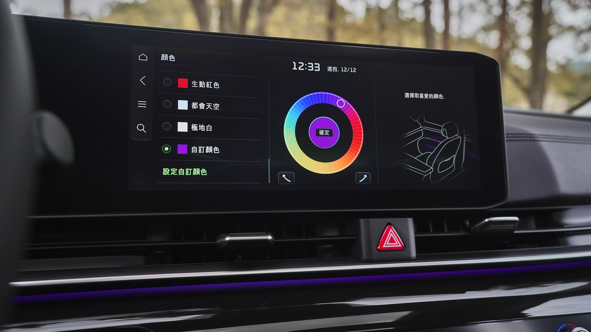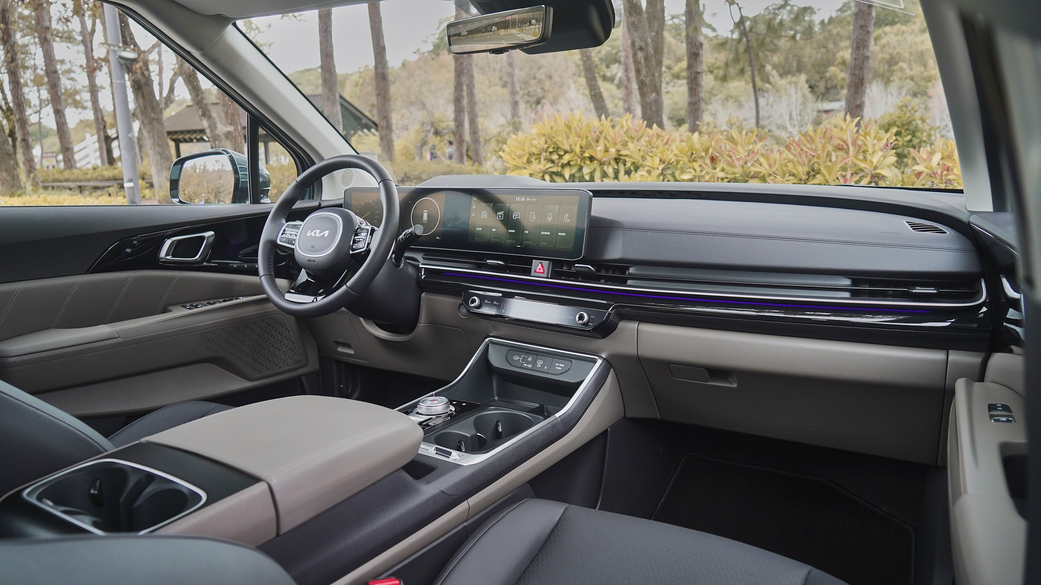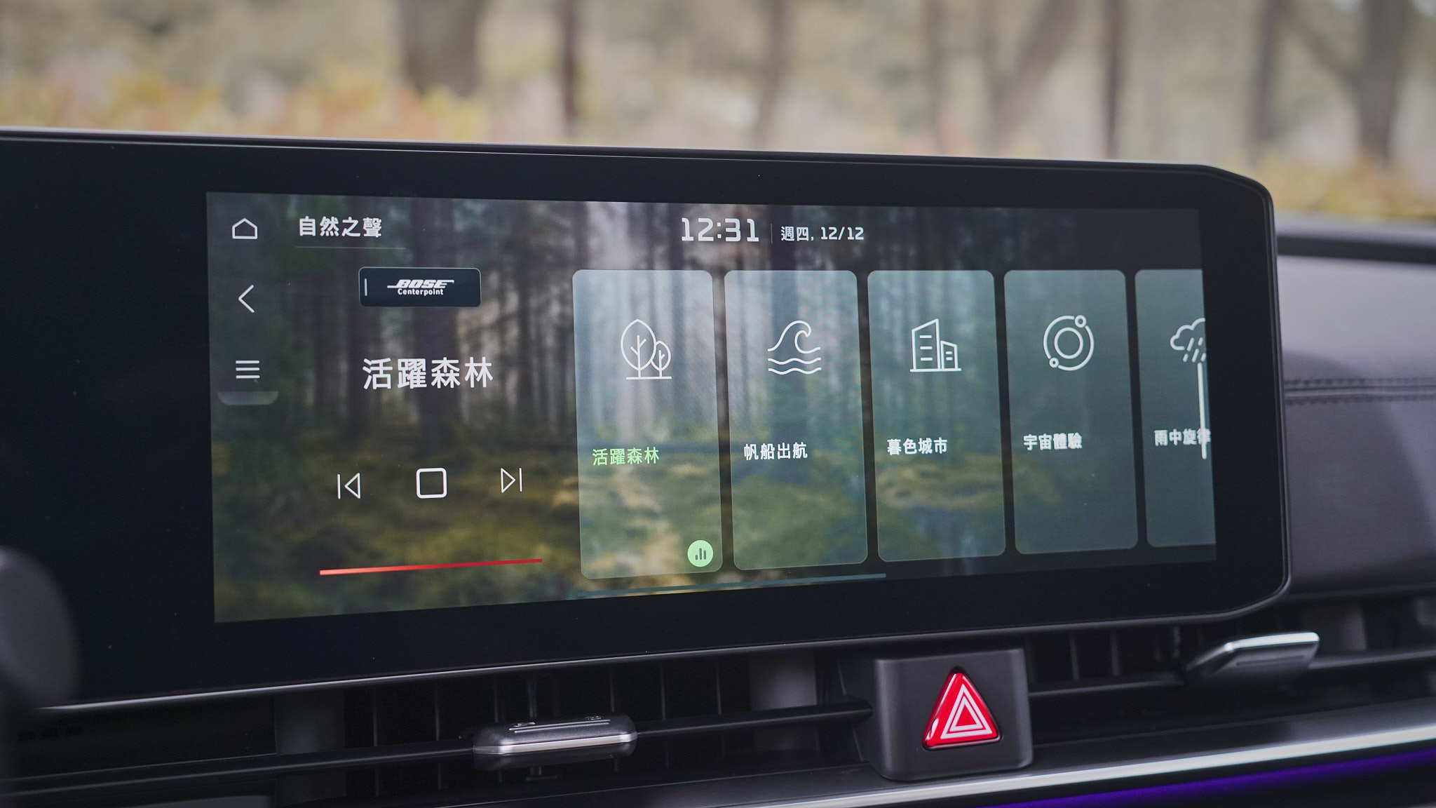 坐進車內的感覺很熟悉,大號曲面螢幕師法EV9的概念,將儀表板與中控螢幕巧妙分隔,讓人感動的是,中控台常用的主要功能仍為機械旋鈕設計,透過一個按鍵,可以將介面切換成影音或是空調面板。值得一提的還有全新導入的64色可調氛圍燈與BOSE特調的汽車音響(這部份我們另外拍影片來好好解說),讓人休息放鬆的自然之聲也是師法EV9的概念,休息時可以播放自然音效讓心靈放空,充分解放疲勞身心。