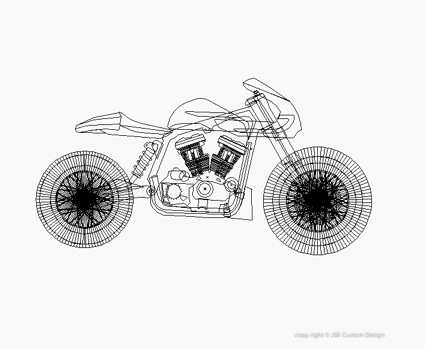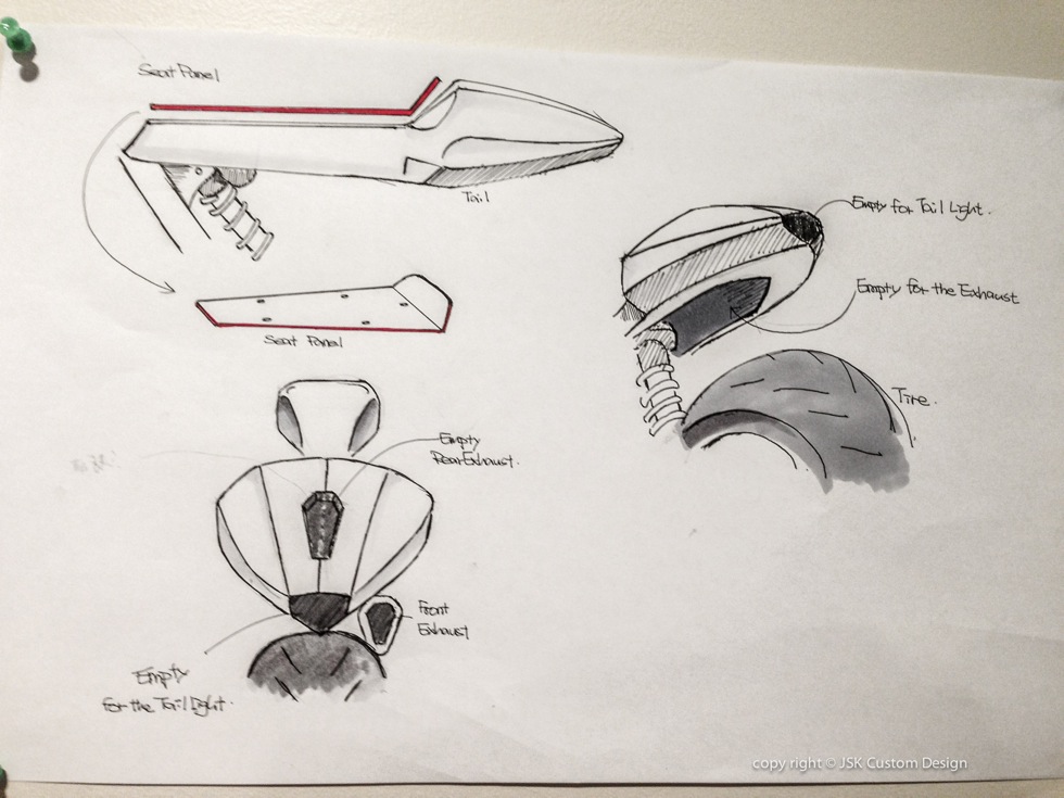 再來就是考慮有整流罩,或是沒有的部份。 畫整流罩草圖的時候,當時有幾個版本是有遮住引擎的,但是因為已經選擇用哈雷來做這台車,引擎部分具有其象徵意義及重要性,擋住之後好像當初選用哈雷就失去了一些感覺,所以後來的版本引擎是外露的,而fairing其中的一條線條,是跟引擎的上缸蓋成水平,可以從設計圖看出。
