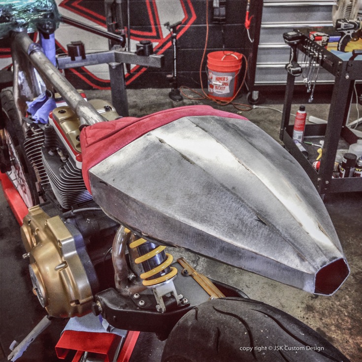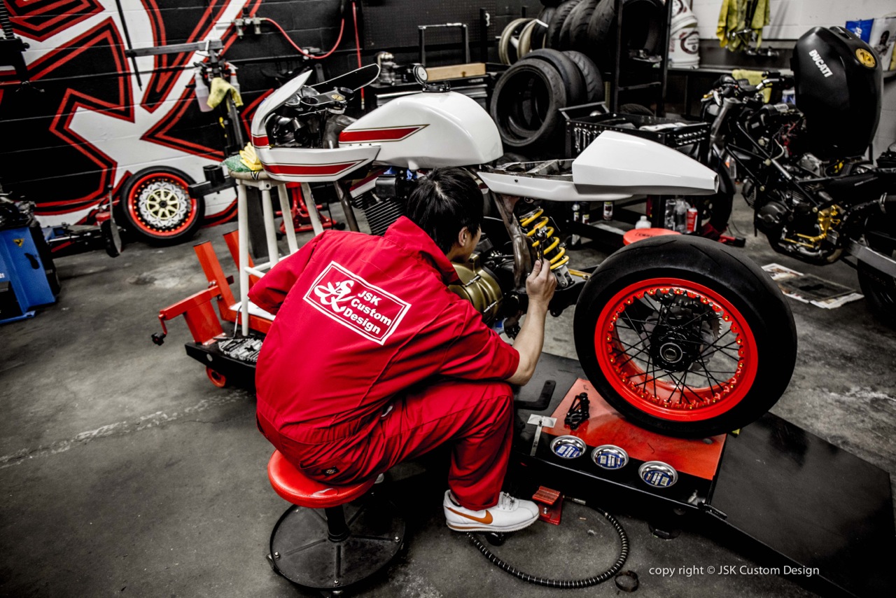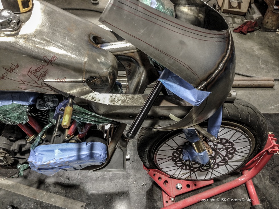 承述之前的 ”老線條,新元素”,設計時我希望這台哈雷的CafeRacer前後的懸吊是倒立式避震,以及單搖臂。所以當時從Ducati 916這台車的車款,移植了前面的倒立式前剎,以及單槍式後搖壁。 但是當時原廠的Ducati Swing Arm 只有鋁合金輪框,三爪式的,我覺得不符合車身的線條,而後期ducati輪框雖然可以裝的上916的swing arm,但是我不想要車子完工後當別人看到她時,會說:『喔喔喔 那是xxx的後輪框...』