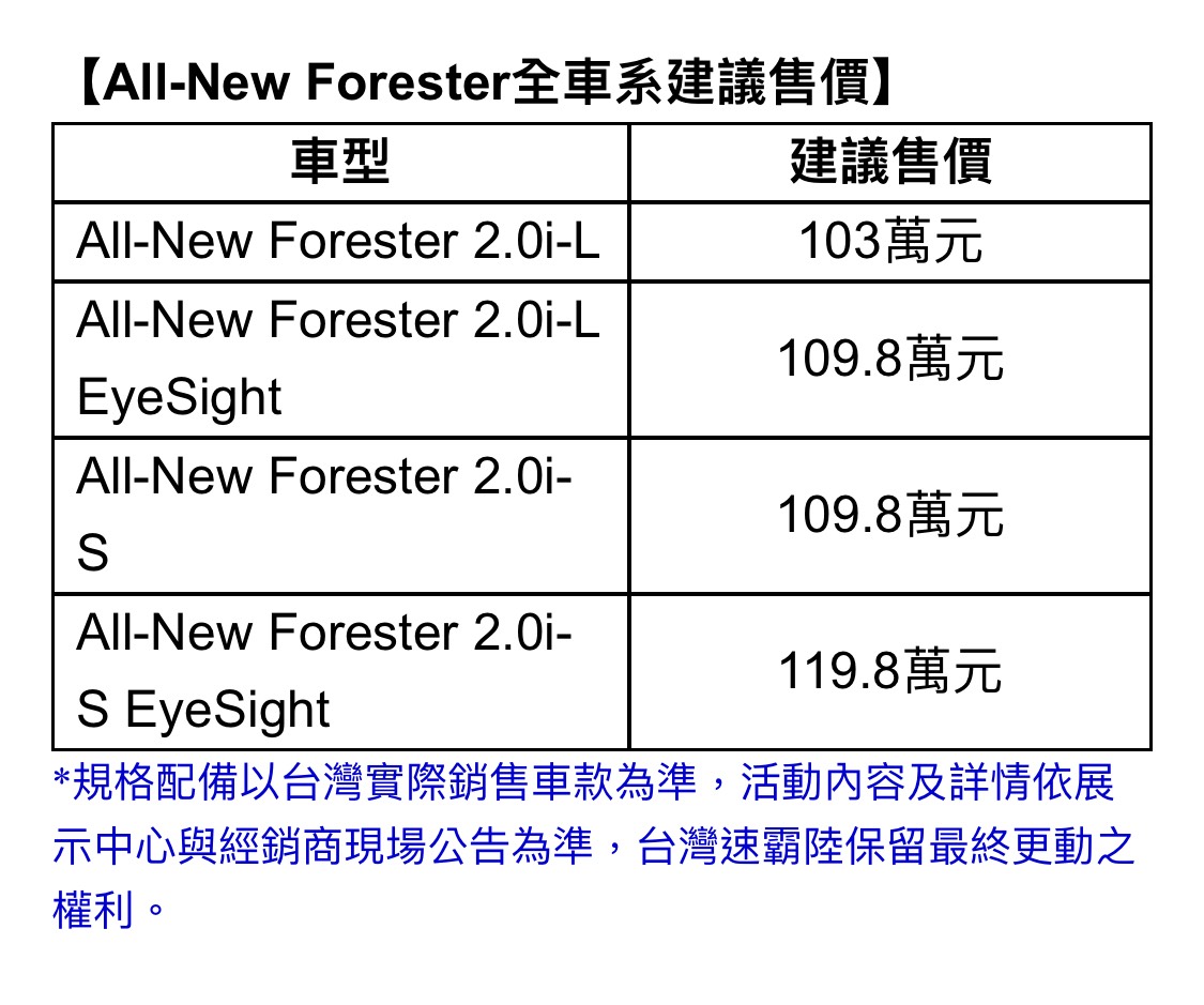 94要NA啦! 大改款森林人Subaru Forester 售價103萬起正式開賣